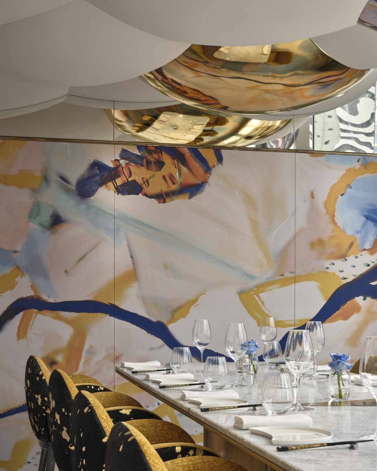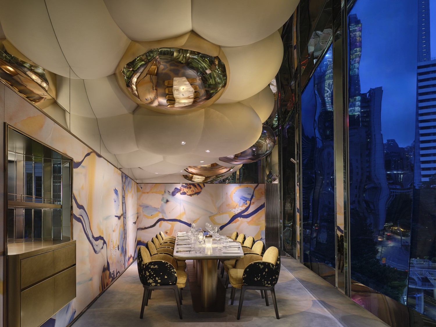 受到花瓣柔美幾何形態的啓發,這把椅子演變爲圓潤、棉花糖般的輪廓—呼應了Akira Back私享餐廳天花板的雕塑造型。椅背採用Pavoni黑色馬毛皮革包覆,絲滑光澤上點綴着如塗鴉般的金色飛濺。在光影變化下,這些金點散發出如融化糖塊或意外滴落的液態金般的蜜色光暈。內座面選用Promitheia金色絨布,閃爍着如星點般細膩微光。